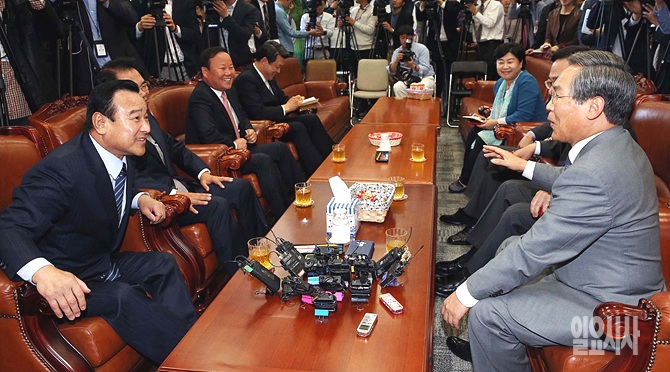 14일, 서울 여의도 국회에서 새누리당 이완구 원내대표, 김재원 원내수석부대표 등 원내대표단과 새정치민주연합 우윤근 원내대표 서영교 원내대변인 등 여야 원내대표단이 화기애애한 분위기로 여야 원내대표 회담을 갖고 있다.