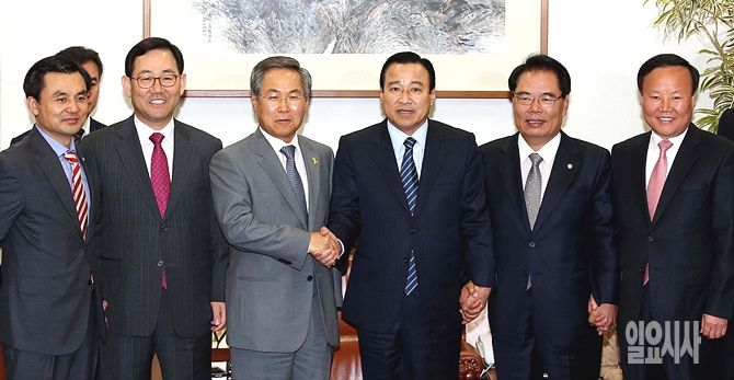 14일, 서울 여의도 국회에서 이완구·우윤근 여야 원내대표가 회담 전, 악수를 나누고 있다.