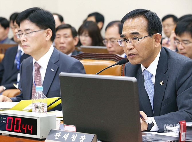 14일 오후, 서울 여의도 국회 기획재정위원회 회의실에서 열린 2014 국정감사 도중 증인으로 출석한 김낙회 관세청장이 답변하고 있다.