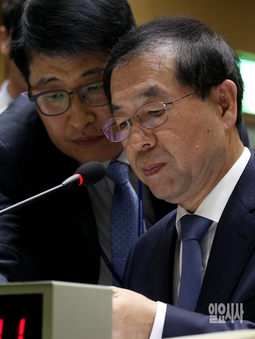 박원순 서울시장이 14일 서울시청에서 열린 국회 안전행정위원회의 서울시 국정감사에서 관계자에게 보고를 받고 있다.