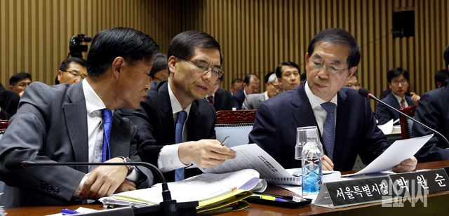 박원순 서울시장(맨 오른쪽)이 14일 서울시청에서 열린 국회 안전행정위원회의 서울시 국정감사에서 관계자에게 보고를 받고 있다.