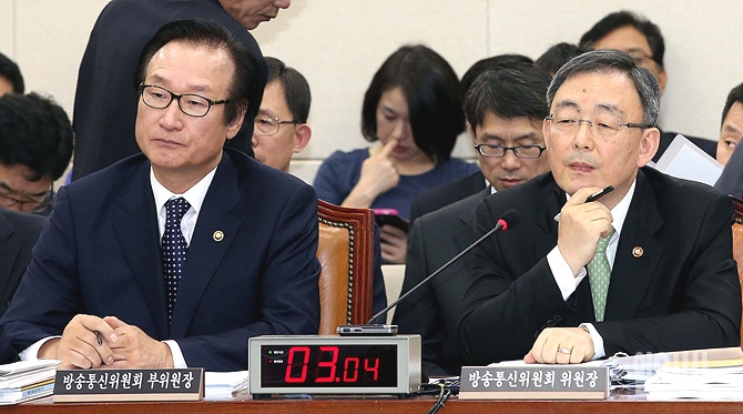 14일 오후, 서울 여의도 국회 미래창조과학위원회 회의실에서 열린 2014 국정감사에서 최성준 방통위원장(사진 오른쪽)이 잠시 생각에 잠겨 있다.