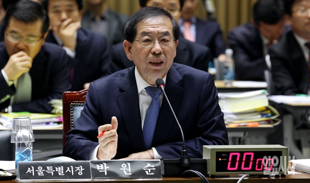 박원순 서울시장이 14일 서울시청에서 열린 국회 안전행정위원회의 서울시 국정감사에서 의원들의 질의에 답하고 있다.