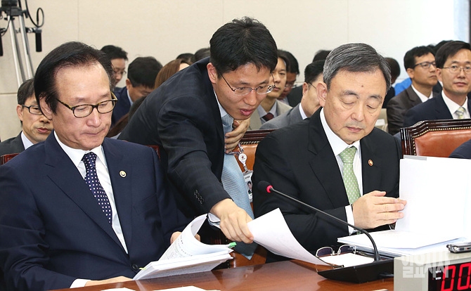 14일 오후, 서울 여의도 국회 미래창조과학위원회 회의실에서 열린 2014 국정감사 도중 방통위 한 관계자가 최성준 방통위원장에게 자료를 건네고 있다.