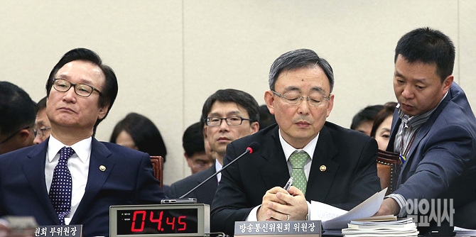 14일 오후, 서울 여의도 국회 미래창조과학위원회 회의실에서 열린 2014 국정감사에서 방통위 관계자가 최성준 방통위원장에게 답변자료를 건네고 있다.