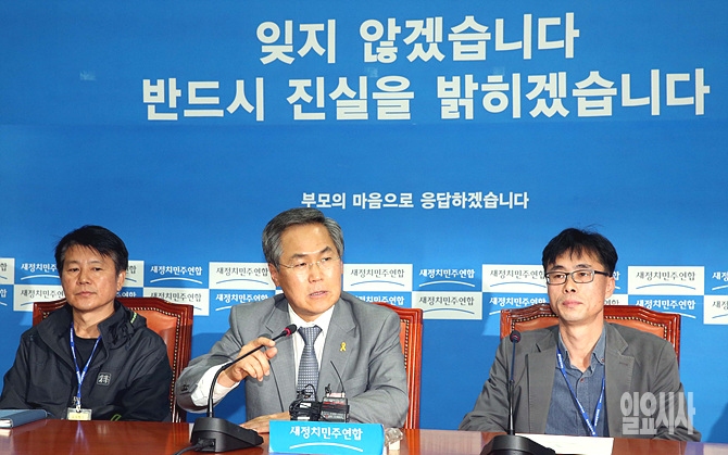 14일 오후, 서울 여의도 국회에서 우윤근 새정치민주연합 원내대표(사진 가운데)가 전명선 세월호대책위원장(사진 오른쪽) 등과 회동하고 있다.