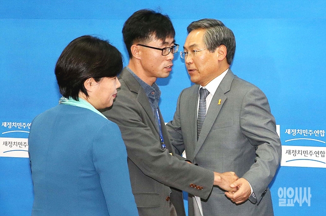 14일 오후, 서울 여의도 국회에서 우윤근 새정치민주연합 원내대표가 전명선 세월호대책위원장 등과 회동 직전, 얼싸안고 있다.