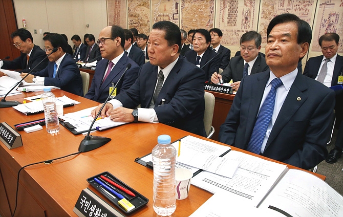 14일 오후, 서울 여의도 국회에서 열린 교육문화관광체육위원회 국정감사에 증인으로 이창섭 국민체육공단 이사장, 이병건 사행산업통합감독위원장, 김정행 대한체육회장, 서상기 국민생활체육회장(사진 왼쪽부터)이 출석해 있다.