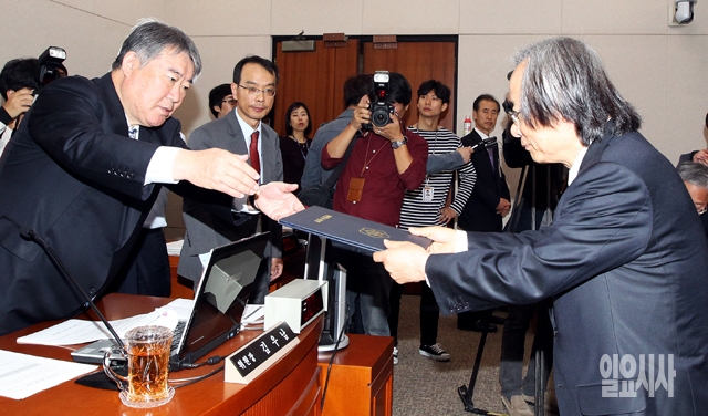이주영 해양수산부 장관(오른쪽)이 15일 서울 여의도 국회에서 열린 농림축산식품해양수산위원회의 국정감사에서 김우남 위원장에게 선서문을 제출하고 있다.