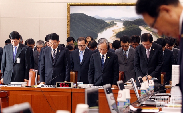 이주영 해양수산부 장관을 비롯한 참석자들이 15일 서울 여의도 국회에서 열린 농림축산식품해양수산위원회의 국정감사에서 세월호 희생자들에 대한 묵념을 하고 있다.