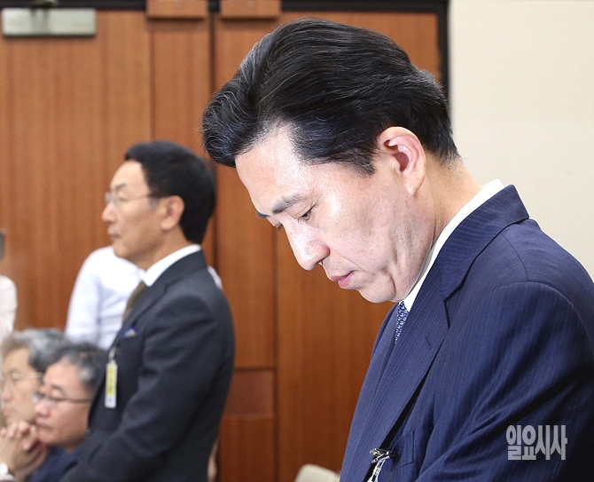 15일 오후, 서울 여의도 국회 정무위원회 회의실에서 열린 2014 정무위 국감에서 증인으로 출석한 임영록 전 KB금융지주 회장이 고개를 숙이고 있다.