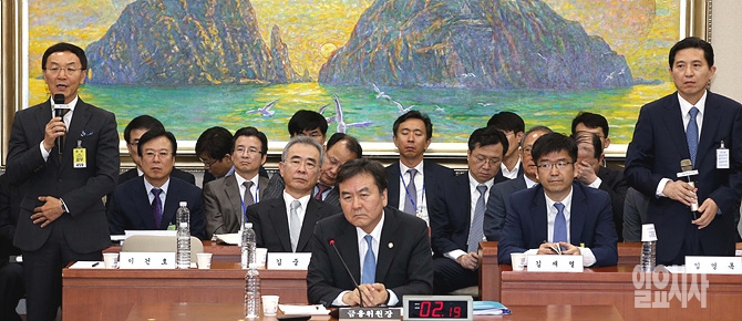15일 오후, 서울 여의도 국회 정무위원회 회의실에서 열린 2014 정무위 국감에 신제윤 금융위원장 등이 증인으로 출석한 가운데, 이건호 전 국민은행장이 의원들의 질의에 답변하고 있다.