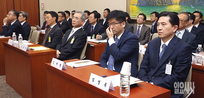 15일 오후, 서울 여의도 국회 정무위원회 회의실에서 열린 2014 정무위 국감에서 임영록 전 KB금융지주 회장, 김재열 KB금융지주 CIO, 이건호 전 국민은행장 등이 증인으로 출석해 있다.
