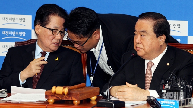 박지원 새정치민주연합 비대위원(맨 오른쪽)이 15일 서울 여의도 국회에서 열린 비상대책위원회의에서 관계자와 대화하고 있다.