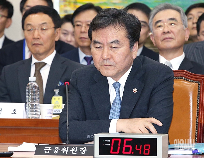 15일 오후, 서울 여의도 국회 정무위원회 회의실에서 열린 정무위 국감에서 증인으로 신제윤 금융위원장이 심각한 표정을 하고 있다.
