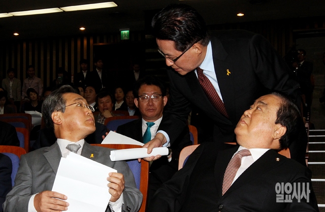 새정치민주연합 문희상 비상대책위원장과 우윤근 원내대표가 15일 서울 여의도 국회에서 열린 의원총회에서 박지원 비대위원을 바라보고 있다.
