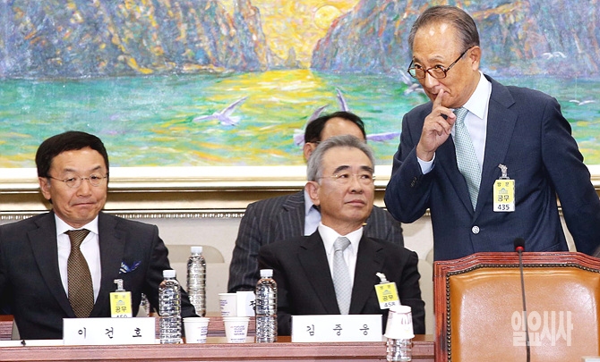 15일 오후, 서울 여의도 국회 정무위원회 회의실에서 열린 정무위 국감에서 증인으로 출석한 김중웅 KB국민은행 이사회 의장(사진 가운데)이 김승유 전 하나은행 회장으로부터 귓속말 보고를 받고 있다.