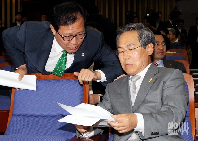 우윤근 새정치민주연합 원내대표(오른쪽)가 15일 서울 여의도 국회에서 열린 의원총회에서 문병호 의원과 대화하고 있다.