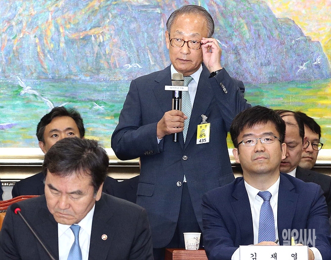 15일 오후, 서울 여의도 국회 정무위원회 회의실에서 열린 정무위 국정감사에서 김승유 전 하나은행 회장이 의원들의 질의를 받고 있다.