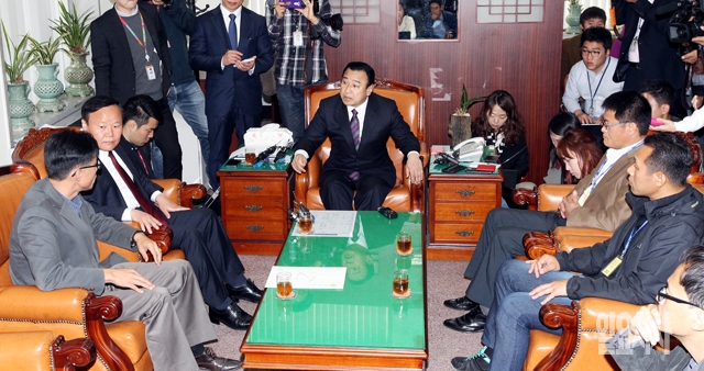 이완구 새누리당 원내대표가 15일 서울 여의도 국회에서 세월호 가족대책위 전명선 위원장을 비롯한 유가족들과 면담을 갖고 있다.