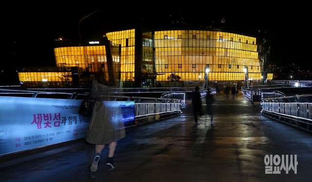 서울 한강 반포대교 남단에 위치한 인공섬이자 수상 컨벤션 시설인 세빛둥둥섬이 15일 새 이름 '세빛섬'으로 전면 개장했다. 사진은 이날 저녁 세빛섬의 야경.