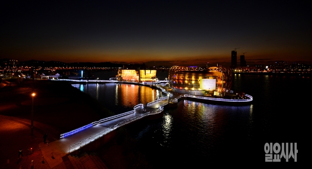 서울 한강 반포대교 남단에 위치한 인공섬이자 수상 컨벤션 시설인 세빛둥둥섬이 15일 새 이름 '세빛섬'으로 전면 개장했다. 사진은 이날 저녁 세빛섬의 야경.