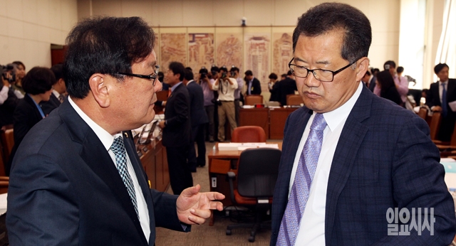 16일 서울 여의도 국회에서 열린 교육문화체육관광위원회의 국정감사가 황우여 교육부장관의 출석 요구 문제로 정회된 가운데 신성범 새누리당 간사(오른쪽)와 김태년 새정치민주연합 간사가 논의를 하고 있다.