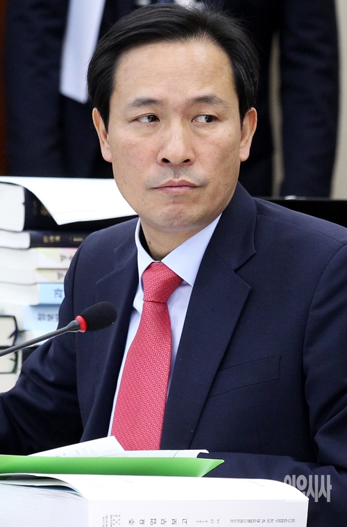 우상호 새정치민주연합 의원이 16일 서울 여의도 국회에서 열린 미래창조과학방송통신위원회의 국정감사를 지켜보고 있다.