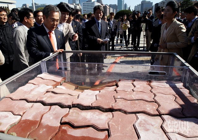 새정치민주연합 우윤근 원내대표와 환경노동위원회 소속 의원들이 16일 서울 여의도 국회 본청 계단 앞에서 노후 상·하수도관 누수에 인한 토사유출 및 상층지반 붕괴현상(싱크홀) 모형실험을 지켜보고 있다.