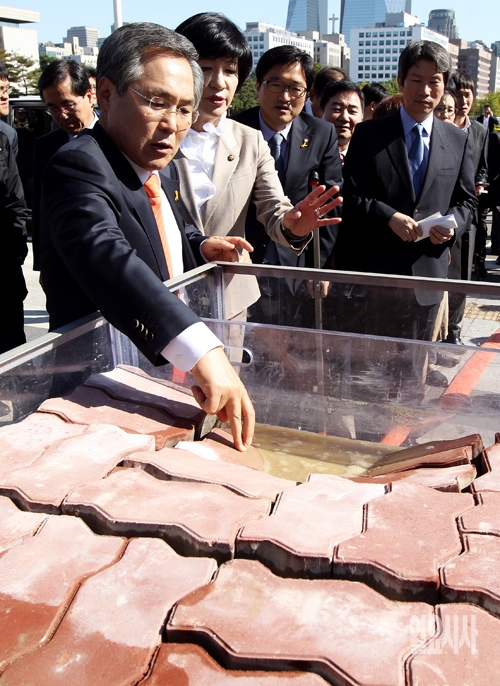 새정치민주연합 우윤근 원내대표와 환경노동위원회 소속 의원들이 16일 서울 여의도 국회 본청 계단 앞에서 노후 상·하수도관 누수에 인한 토사유출 및 상층지반 붕괴현상(싱크홀) 모형실험을 지켜보고 있다.
