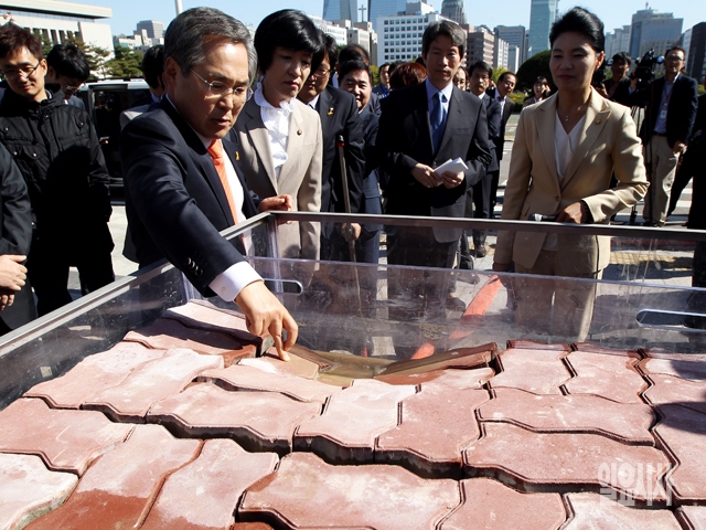 새정치민주연합 우윤근 원내대표와 환경노동위원회 소속 의원들이 16일 서울 여의도 국회 본청 계단 앞에서 노후 상·하수도관 누수에 인한 토사유출 및 상층지반 붕괴현상(싱크홀) 모형실험을 지켜보고 있다.