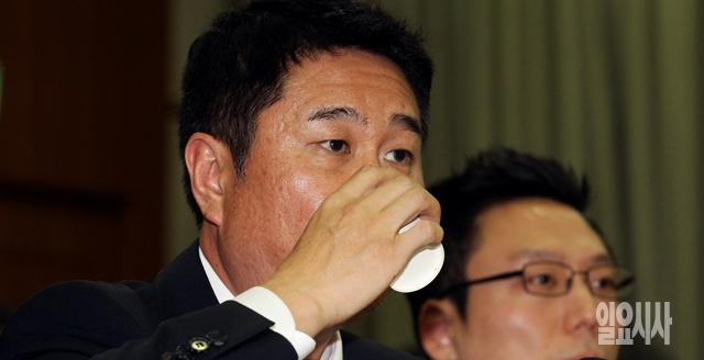 이석우 다음카카오 공동대표가 16일 서울 서초동 서울고등검찰청에서 열린 국회 법제사법위원회의 서울고등검찰청 등에 대한 국정감사에 참고인 신분으로 출석해 물을 마시고 있다.