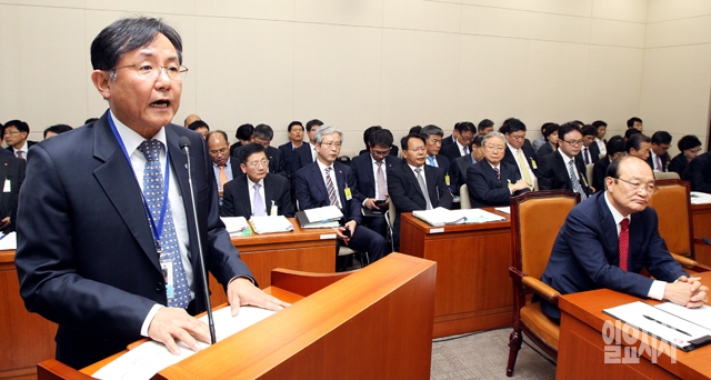 손명세 건강보험심사평가원장이 16일 서울 여의도 국회에서 열린 보건복지위원회의 국정감사에서 업무보고를 하고 있다.