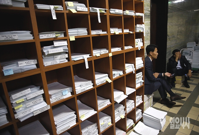 16일 오후, 서울 여의도 국회 교육문화체육관광위원회 회의실에서 열린 교문위 국감장 앞에서 피감기관 관계자들이 피곤한 표정으로 자료 위에 앉아 있다.
