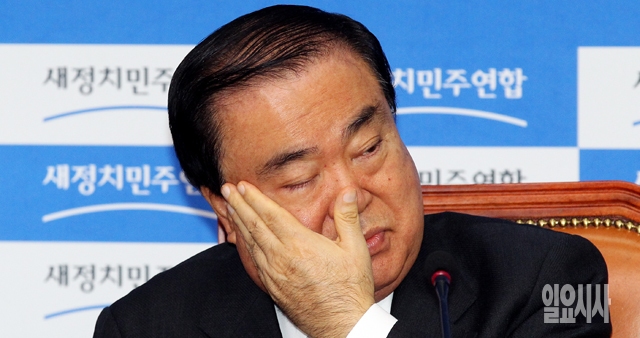 문희상 새정치민주연합 비대위원장이 17일 서울 여의도 국회에서 열린 확대간부회의에서 얼굴을 만지고 있다.