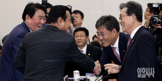 17일 서울 여의도 국회에서 열린 기획재정위원회의 국정감사에 앞서 최경환 경제부총리(왼쪽부터)와 새누리당 이완구 원내대표, 정문헌, 이한구 의원이 대화하고 있다.