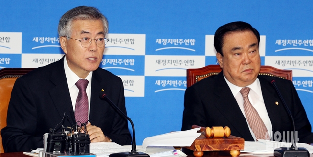 새정치민주연합 문재인 비대위원(왼쪽)이 20일 서울 여의도 국회에서 열린 비상대책위원회의에서 모두발언을 하고 있다.