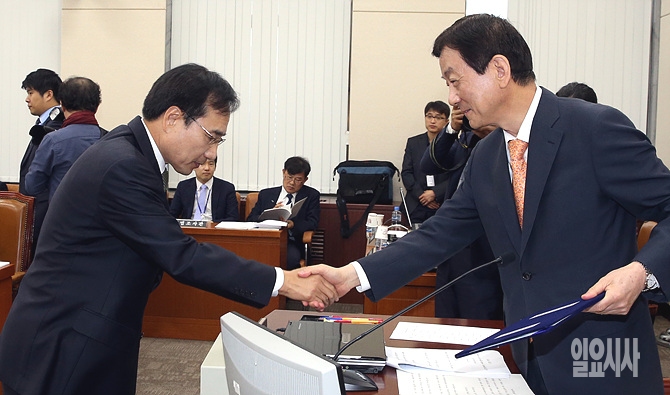 20일 오전, 진영 안행위원장이 서울 여의도 국회에서 열린 안전행정위 국정감사 직전, 증인으로 출석한 문상부 중앙선관위 사무총장과 악수를 나고 있다.