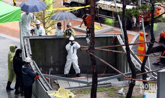 21일 경기도 판교테크노밸리 환풍구 추락사고 현장에서 경찰 관계자들이 국립과학수사연구원과 합동으로 환풍구 덮개 받침대의 하중 강도실험을 하고 있다.