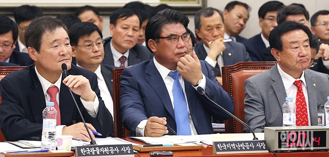 21일, 서울 여의도 국회 산업통상자원위원회 회의실에서 열린 산자부 국정감사에서 고정식 한국광물공사 사장, 김성회 한국지역난방공사 사장, 권혁수 대한석탄공사 사장(왼쪽부터)이 의원들의 질의를 듣고 있다.