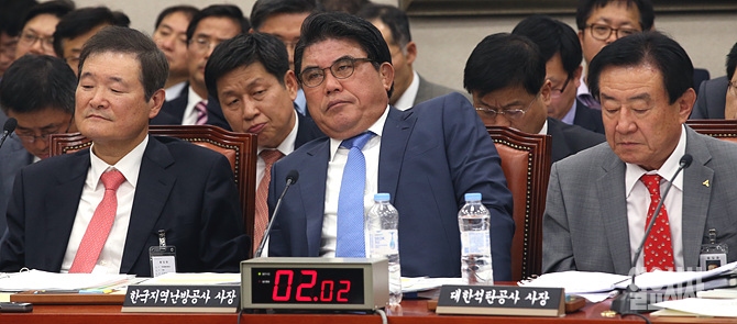 21일, 서울 여의도 국회 산업통상자원위원회 회의실에서 열린 산자부 국정감사 도중 김성회 한국지역난방공사 사장(사진 가운데)이 심각한 표정을 하고 있다.