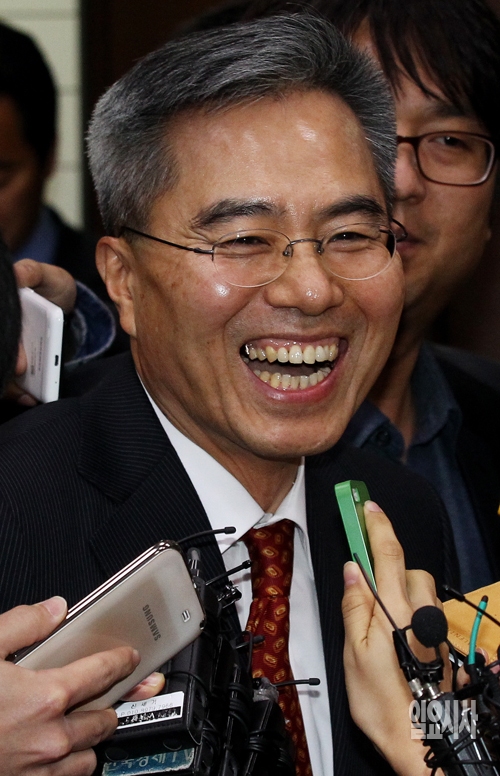 KB금융지주 차기 회장 후보인 하영구 한국씨티은행장이 22일 서울 중구 명동 KB금융지주 본점에서 열린 회장추진위원회와의 심층면접을 마친 뒤 취재진과 만나 밝게 웃고 있다.