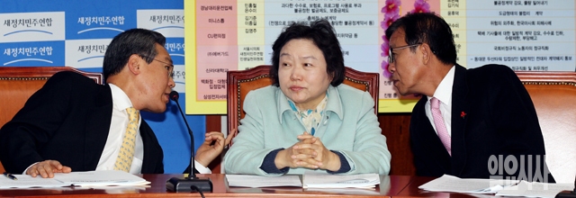 24일 서울 여의도 국회에서 열린 새정치민주연합 비상대책위원회의에서 우윤근 원내대표(왼쪽)와 원혜영 비대위원이 대화하고 있다. 가운데는 인재근 비대위원.