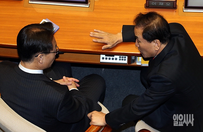 3일, 서울 여의도 국회 본회의장에서 열린 원내교섭단체 대표연설 직전, '친이(친 이명박)계 좌장'으로 통하는 이재오 의원과 '친이'계 인사인 조해진 의원이 이야기를 나누고 있다.