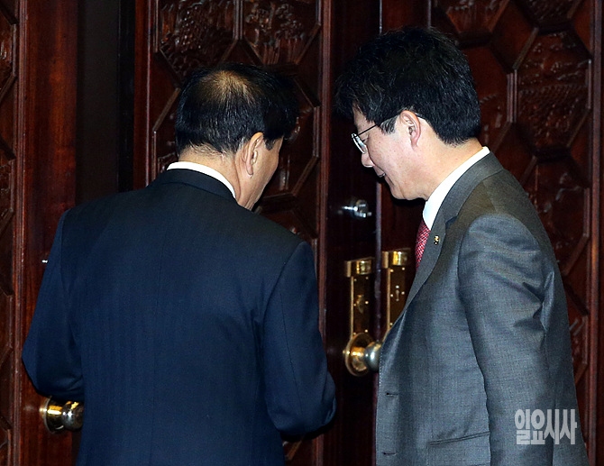 3일, 서울 여의도 국회 본회의장에서 열린 새누리당 김무성 대표 교섭단체 대표연설 직전, '친이(친 이명박)계 좌장' 이재오 의원이 유승민 신임 원내대표와 이야기를 나누고 있다.