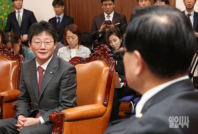 3일, 서울 여의도 국회 의장 집무실에서 새누리당 유승민 신임 원내대표가 정의화 국회의장을 예방한 자리에서 이야기를 나누고 있다.