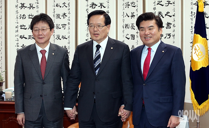 3일, 서울 여의도 국회 의장 집무실에서 새누리당 유승민 신임 원내대표-원유철 정책위의장이 정의화 국회의장 예방 자리에서 기념촬영을 하고 있다.