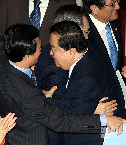 4일 오전, 서울 여의도 국회 본회의장에서 문희상 새정치민주연합 비상대책위원장과 우윤근 원내대표가 반가움의 포옹을 하고 있다.