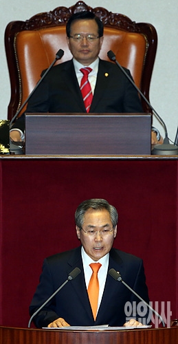 4일, 서울 여의도 국회 본회의장에서 새정치민주연합 우윤근 원내대표가 원내교섭단체 대표연설을 하고 있다.