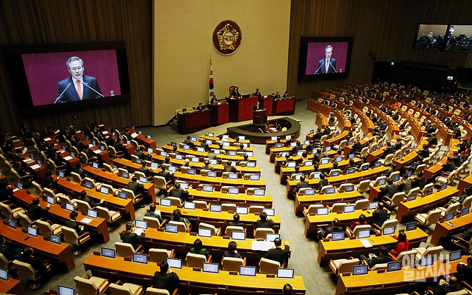 4일, 서울 여의도 국회 본회의장에서 새정치민주연합 우윤근 원내대표가 원내교섭단체 대표연설을 하고 있다.